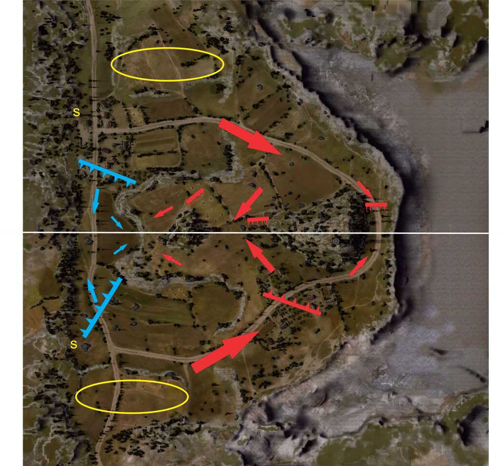 -srednji pravac je najkraći, ima nešto covera ali ne dovoljno za zaštitu velikog platoona od artija. Potreban je snažan i brz proboj ako se ide ovuda jer će vas inače arti pojesti.