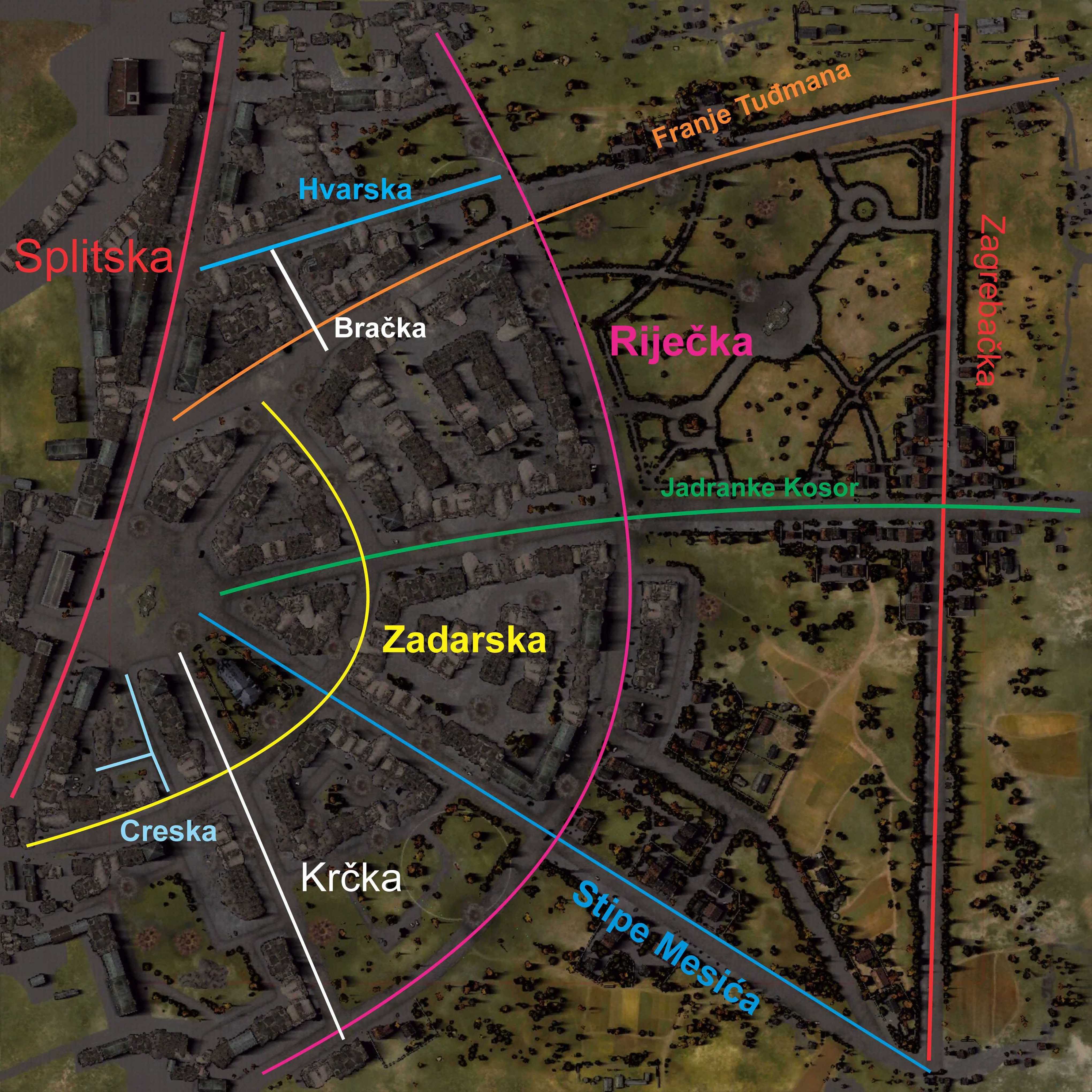 Lingvist je trebao posloziti ulice abecednim redom radi lakšeg pamćenja, tj. odozgora prema dolje: Bračka, Hvarska, Krčka, Zadarska i s lijeva na desno: Riječka, Splitska, Zagrebačka.
