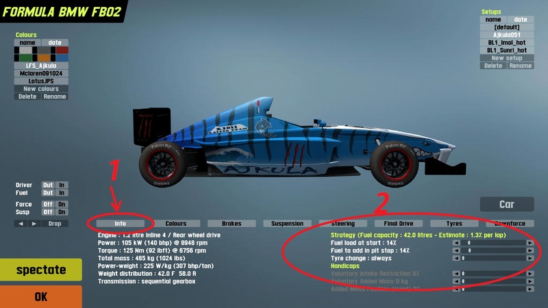 Znaci, udjete sa shift+p u box (prije utrke). Kliknite INFO (oznacen sa brojem 1).Skroz desno (oznaka 2) se nalaze postavke benzina. Racunajte da vam treba 1,3 % goriva za 1 krug. Ako ste odlucili ici jednom u box,pretpostavljam da cete u box otici negdje oko 10-og kruga. Za to vam treba negdje oko 14-15 % goriva. Tamo vas takodjer pita koliko goriva zelite usuti kad dodjete u box. Posto ste vec odvozili 10 krugova,a trebate odvozit jos 10, znaci stavit cete jos 14 %. Ispod je opcija za mjenjanje guma. Dali ih zelite mjenjat ili ne ,ili mjenjat ako su tolko i tolko istrosene. Najbolje je stavit “Allways”. Nek majstor promjeni,pa ste na miru.