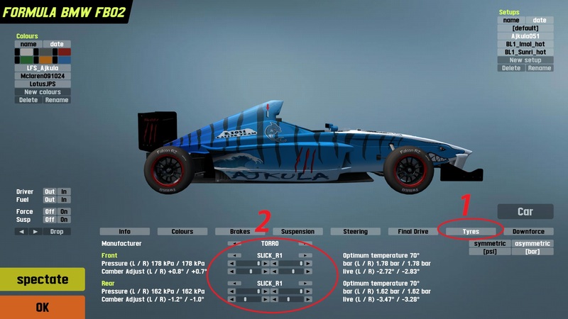 Znaci,kliknete na Tyres (oznaka 1). Pod oznakom 2, mozete birat vrstu guma. Nekako se pokazala R1 kombinacija najbolja. Jest da se malo crvene al uz normalnu voznju i to se moze rjesit.